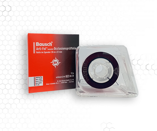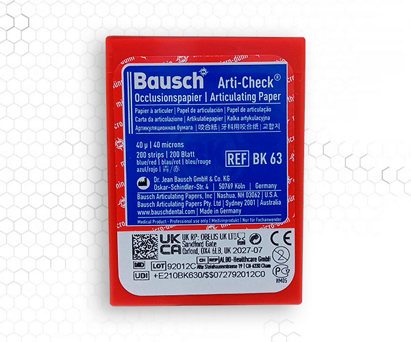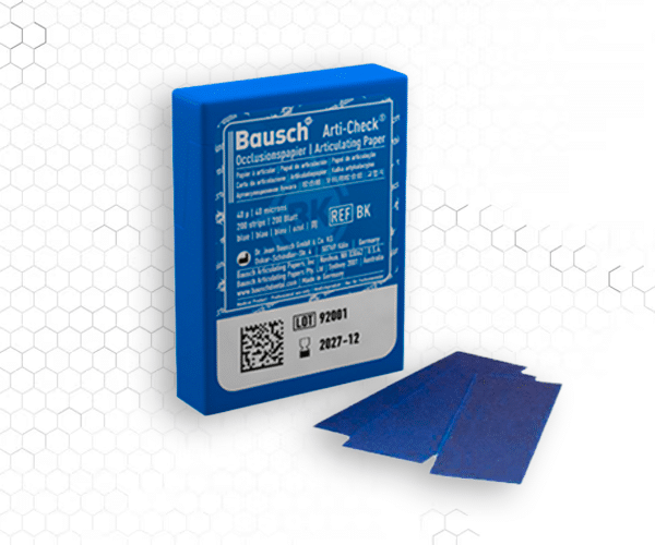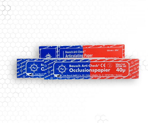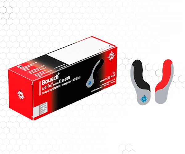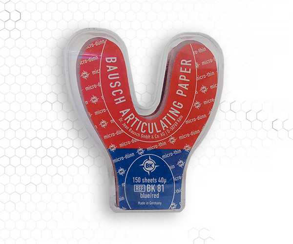 El papel de articular Bausch Arti-Check 40µ en forma de herradura marca contactos oclusales con precisión, gracias a su diseño ultrafino, resistente y con colores líquidos de alta visibilidad.