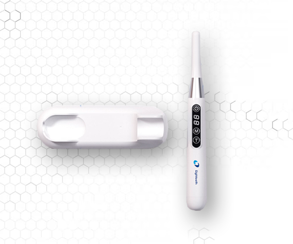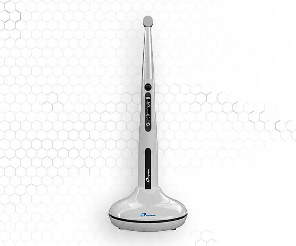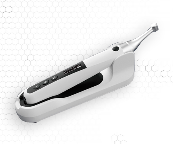 Curing Pen-E: lámpara LED inalámbrica con cabeza giratoria 360° y luz concentrada para un curado rápido y preciso, incluso en molares posteriores. Ideal para resinas con iniciadores como TPO y CQ.